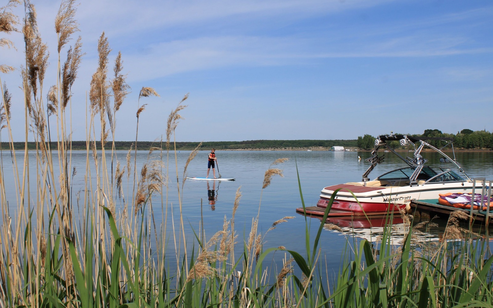 Klidné pádlování po jezeře s pádlem na stojáka, Foto: Eva Lau, Lizenz: Tourismusverband Lausitzer Seenland e.V.