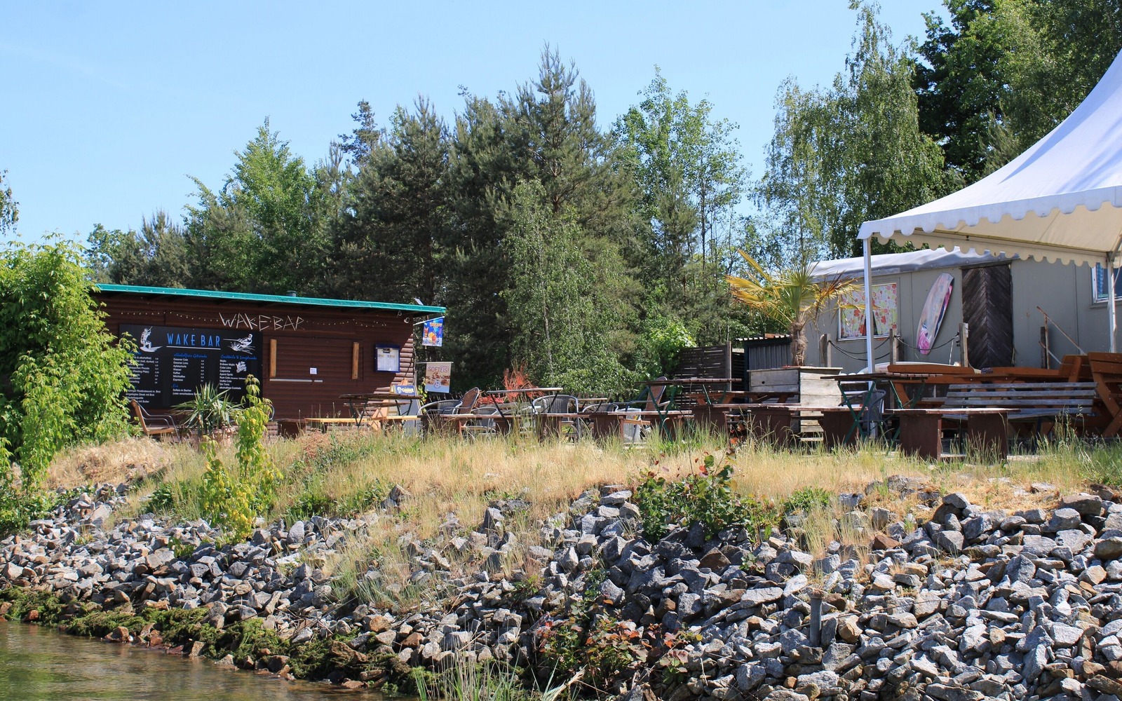 Poté nebo během dne si můžete vychutnat chladivé nápoje a občerstvení v wake baru v areálu. Odpočívat můžete na terase na pláži, odkud je krásný výhled na Geierswaldské jezero a kde můžete z bezpečné vzdálenosti obdivovat vodní podívanou.
