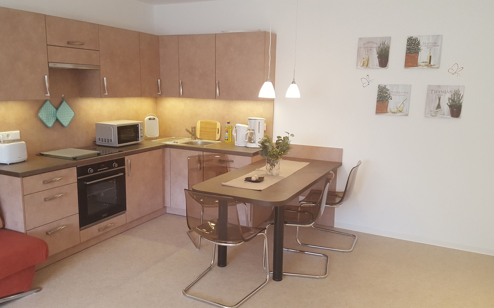 Die Ferienwohnung im Grünen ist modern, komfortabel, barrierefrei und geschmackvoll eingerichtet. Sie befindet sich in ruhiger Lage am Waldrand. Zu ihr gehören zwei Schlafräume für jeweils zwei bzw. drei Personen, eine Küche mit Aufenthaltsraum, ein geräumiges Bad, eine Terasse und zwei Parkplätze. Die Ferienwohnung verfügt über technische Standards wie TV und Internet.