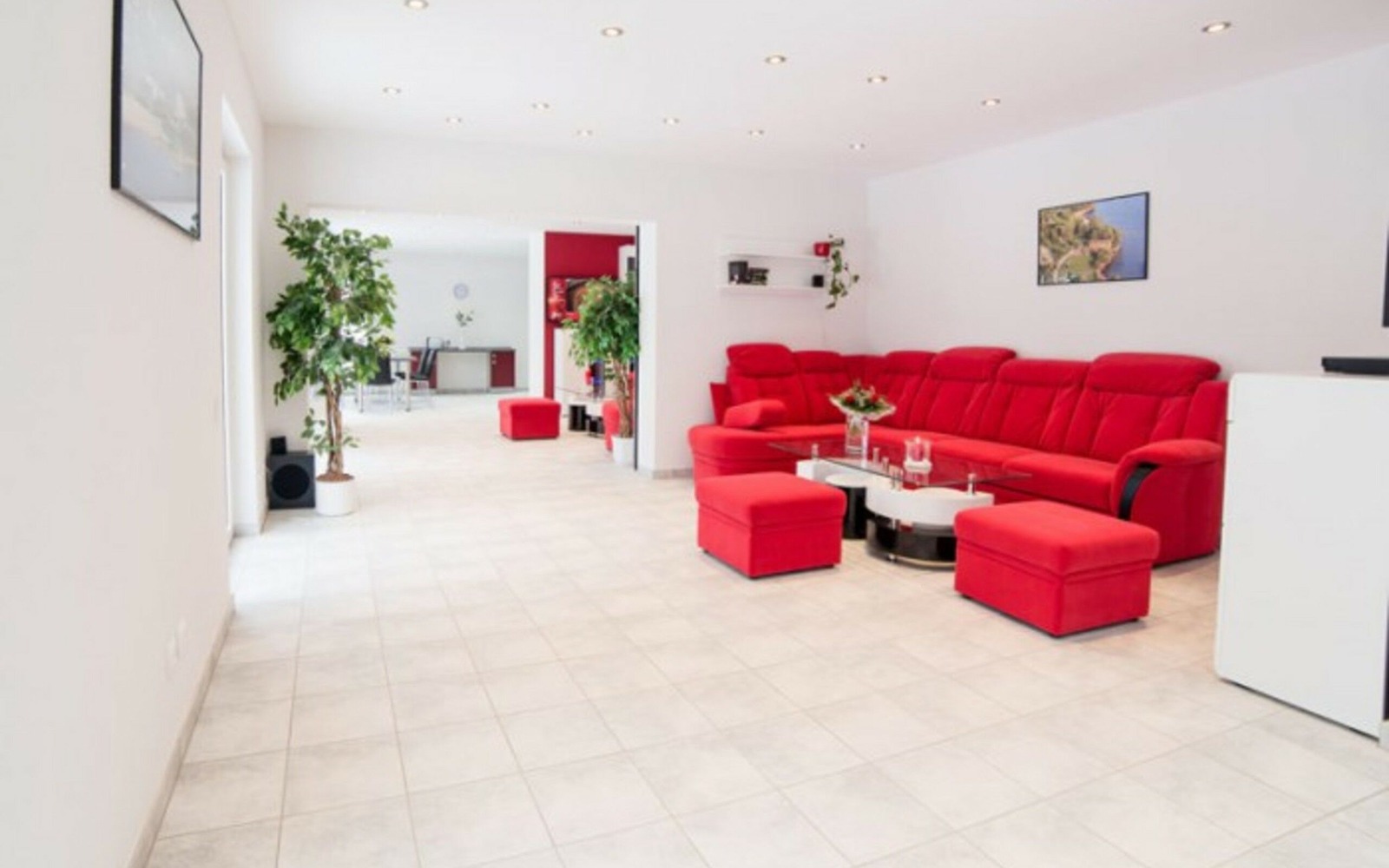 - im Wohnbereich durch eine 2,50 Meter breite, verschließbare, schalldichte Schiebetür in zwei je 135 qm große Ferienwohnungen aufteilbar