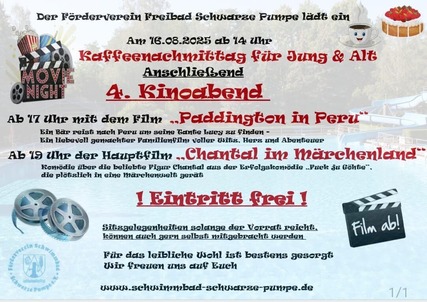 Der Förderverein Freibad Schwarze Pumpe lädt zu einem gemütlichen Kaffeenachmittag für Jung und Alt ein. Im Anschluss folgt der 4. Kinoabend mit zwei Filmen für die ganze Familie. Ab 17 Uhr läuft "Paddington in Peru", ein liebevoll gestalteter Familienfilm voller Witz, Herz und Abenteuer, in dem ein Bär nach Peru reist, um seine Tante Lucy zu finden. Ab 19 Uhr startet der Hauptfilm "Chantal im Märchenland", eine Komödie über die beliebte Figur aus "Fack ju Göhte", die plötzlich in einer märchenhaften Welt landet. Der Eintritt ist frei, Sitzgelegenheiten sind begrenzt, können aber selbst mitgebracht werden. Für das leibliche Wohl ist gesorgt.