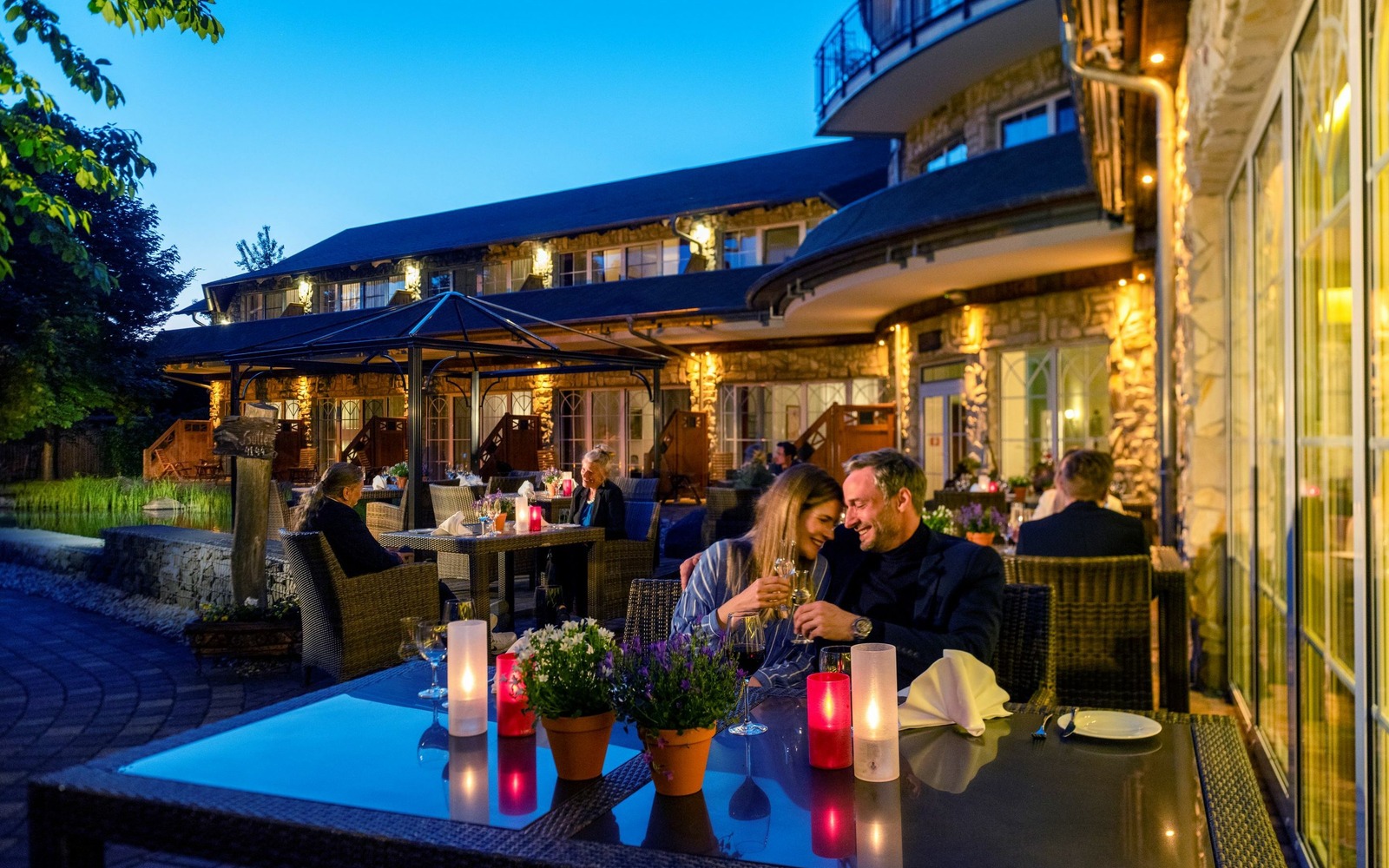 Paar sitzt auf der Terrasse am Schlossteich beim Dinner, Foto: Visiophotos, Lizenz: Wellnesshotel Seeschlößchen