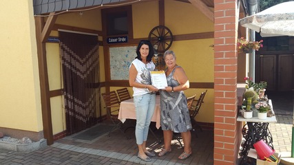 Bildunterschrift: Die Mitarbeiterin der Touristinformation Senftenberg, Birgitt Jacob, übergab die Klassifizierungsurkunde für das Ferienhaus Melanie für die erneute Auszeichnung als 3-Sterne-Ferienhaus an die Vermieterin Frau Scheack (re.).