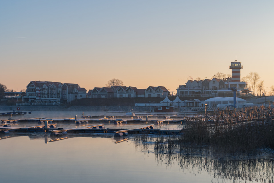 Geierswalder See mit Leuchtturm-Hotel im Winter, Foto: Kathrin Winkler