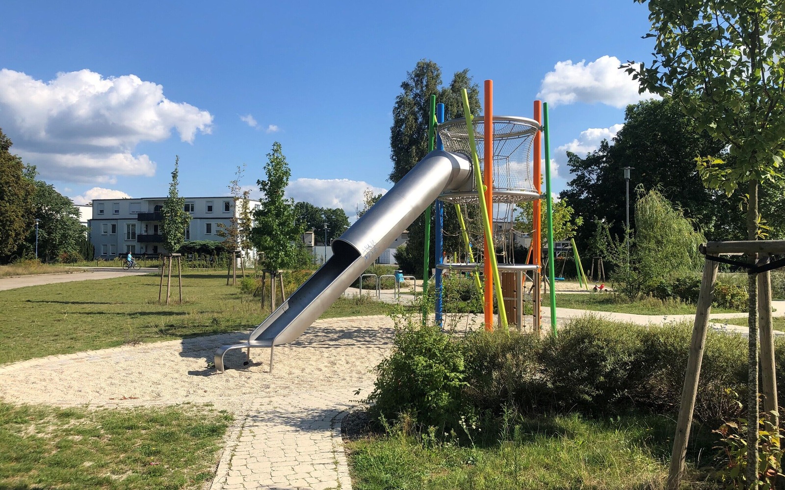 The playground is located in a well-maintained, traffic-calmed area and consists of several age-appropriate play areas. For toddlers, there is a play area with a small climbing frame, a slide, and various balancing and climbing elements. The ground is covered with fine sand, which provides additional safety. In the immediate vicinity is a double swing with a disc-shaped net seat, suitable for several children at the same time.