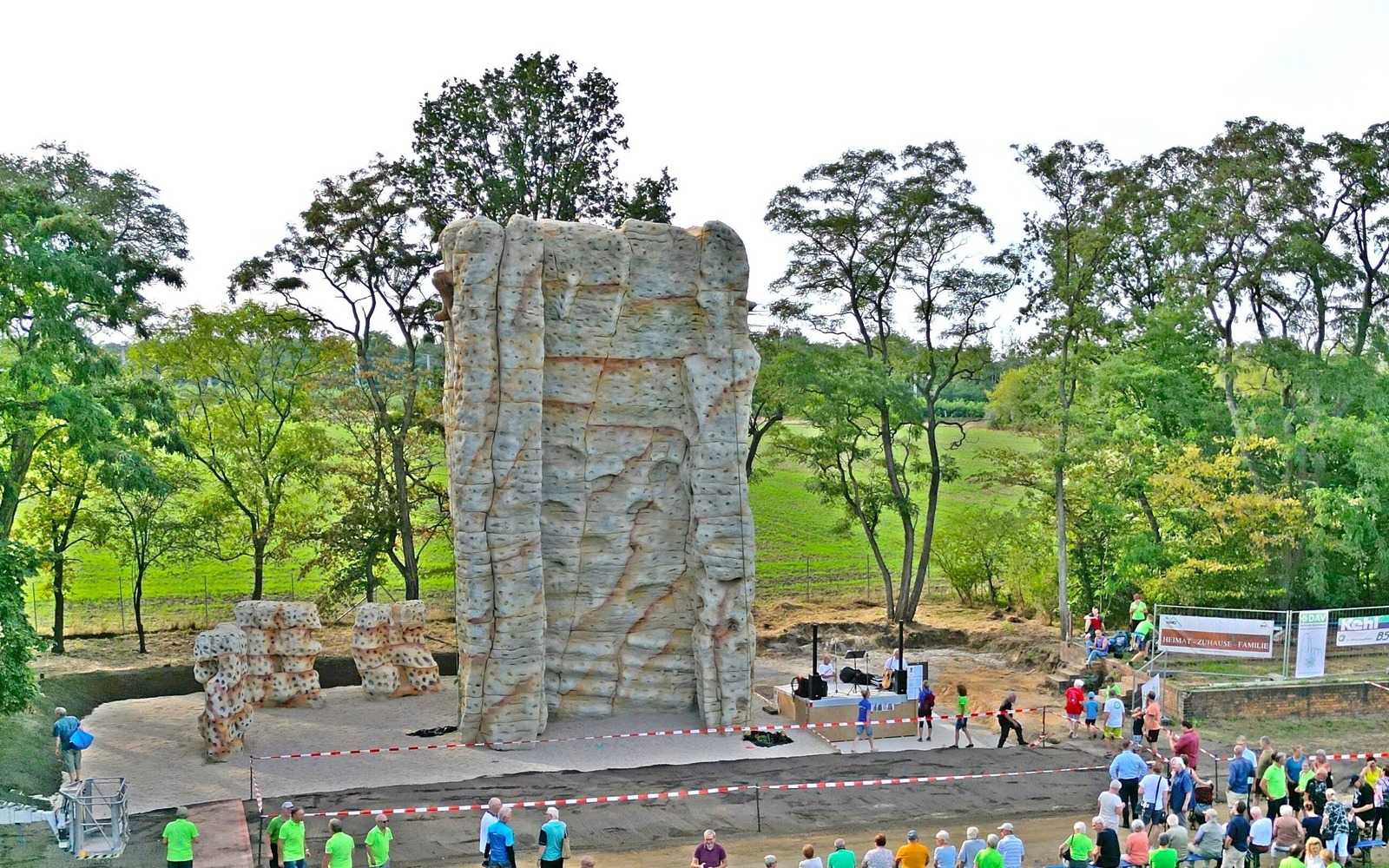 With a base area of 7.5 x 3.5 metres and a height of 13 metres, a total climbing area of approx. 400 m² was created. 161 safety hooks, 15 deflection points, a Saxon abseil ring and, of course, a summit book were installed. The spacious summit area invites you to linger and look around.