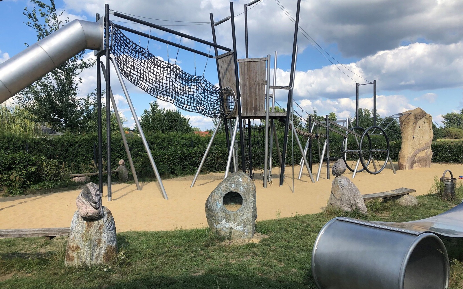 The playground offers a wide range of activities and experiences. Climbing frames with ropes, slides, and balancing equipment invite children to try them out. The area is complemented by a sandpit with seesaws, a small toboggan run, and natural play elements made of wood and stone.
