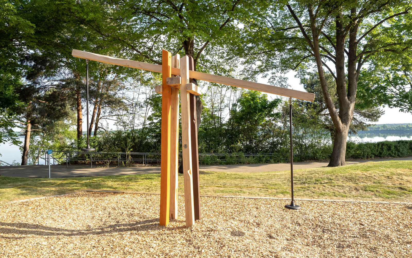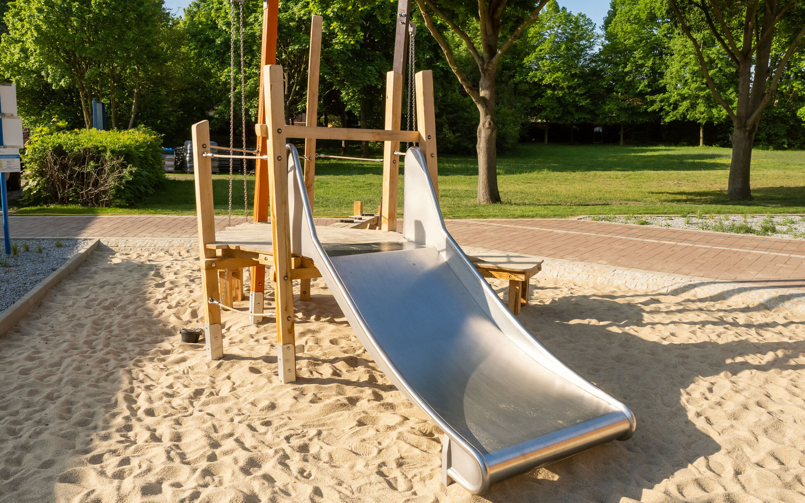 The newly designed playground at the Großkoschen lakeside beach is an exciting place where children up to the age of 12 can discover the mining history of Lusatia through play. Under the motto ‘Miner’, the facility incorporates key elements of former open-cast lignite mining in Lusatia. The highlight is a large bucket wheel excavator that can be climbed on. The offer is complemented by a conveyor ramp with a digging station, a wobbly coal slab bridge and a slide that recreates the removal of the coal. The design of the site is also reminiscent of open-cast mining: mounds in brown symbolise spoil heaps. The playground brings the structural change in the region to life in a child-friendly way.